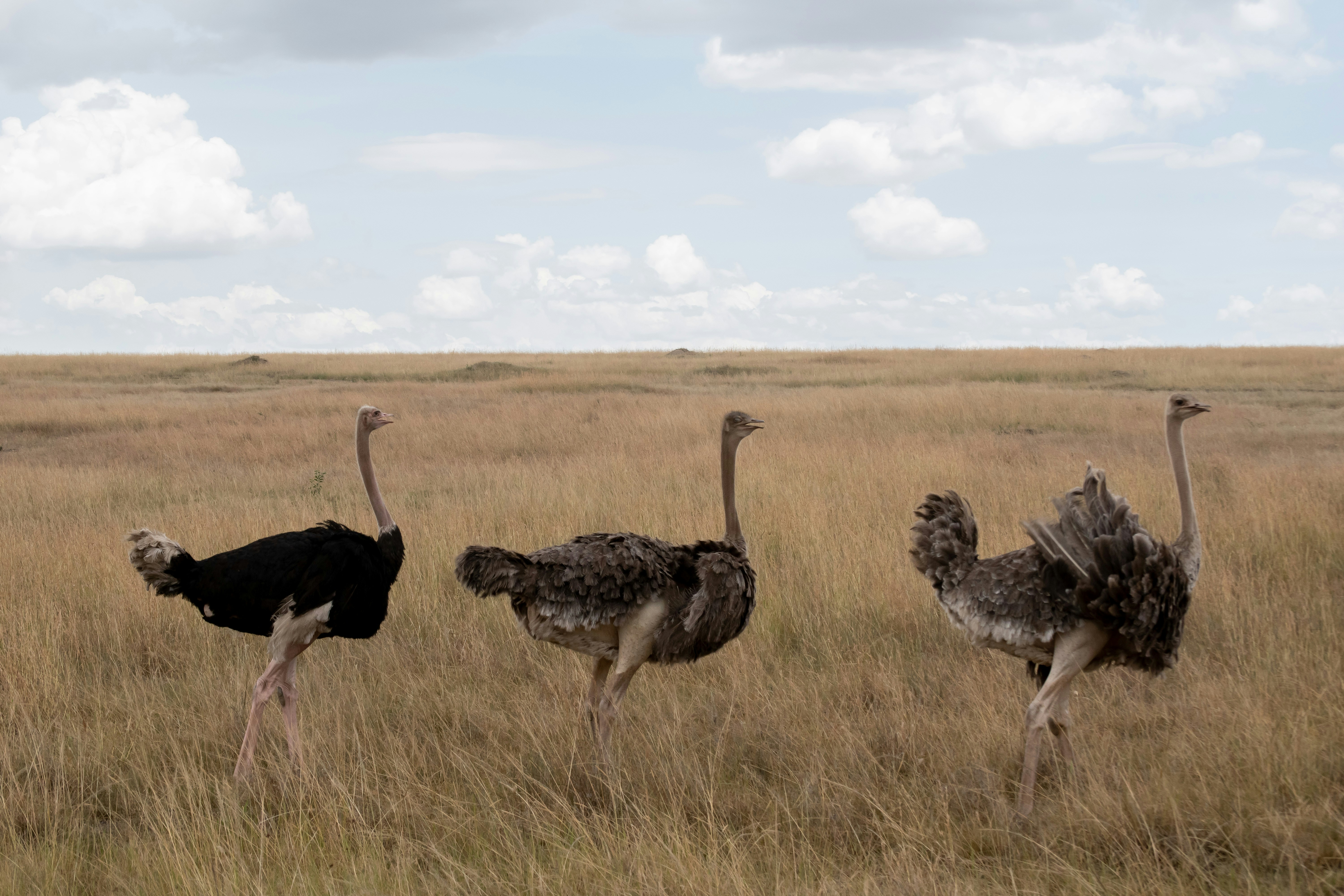 three black ostriches on field